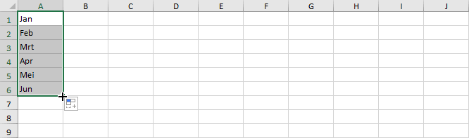 4. Selecteer cel A1 en sleep dan het groene selectie kader naar beneden aan het vierkantje rechts onder. Automatisch aanvullen vult de lijst aan met alle maanden.