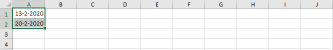 12. Voer in cel A1 de waarde “13-02-2020” in en in cel A2 de waarde “20-02-2020”.