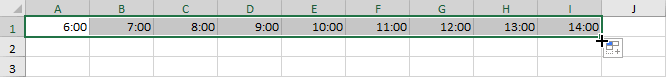 15. Selecteer cel A1 en sleep nu de het groene selectie kader naar rechts aan het vierkantje rechts onder. Automatisch aanvullen vult nu in elke cel een tijdstip in.